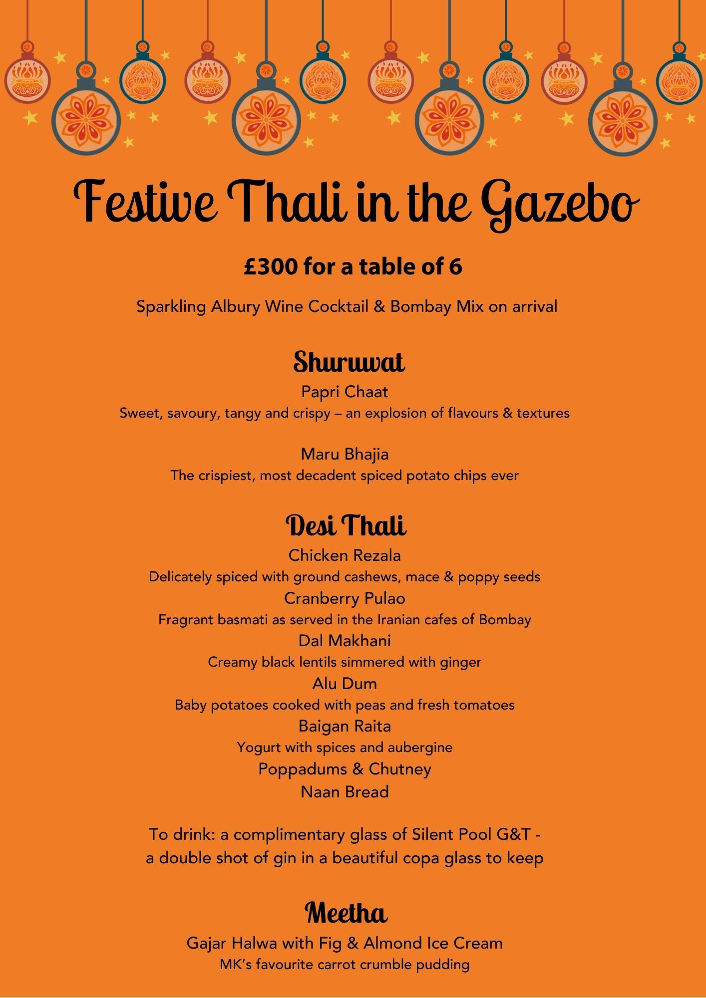 A Festive Thali in the Gazebo experience is available from 6pm to 8pm on December 16, 17, 18, 21, 22 and 23 at a cost of £300 for a table of six.