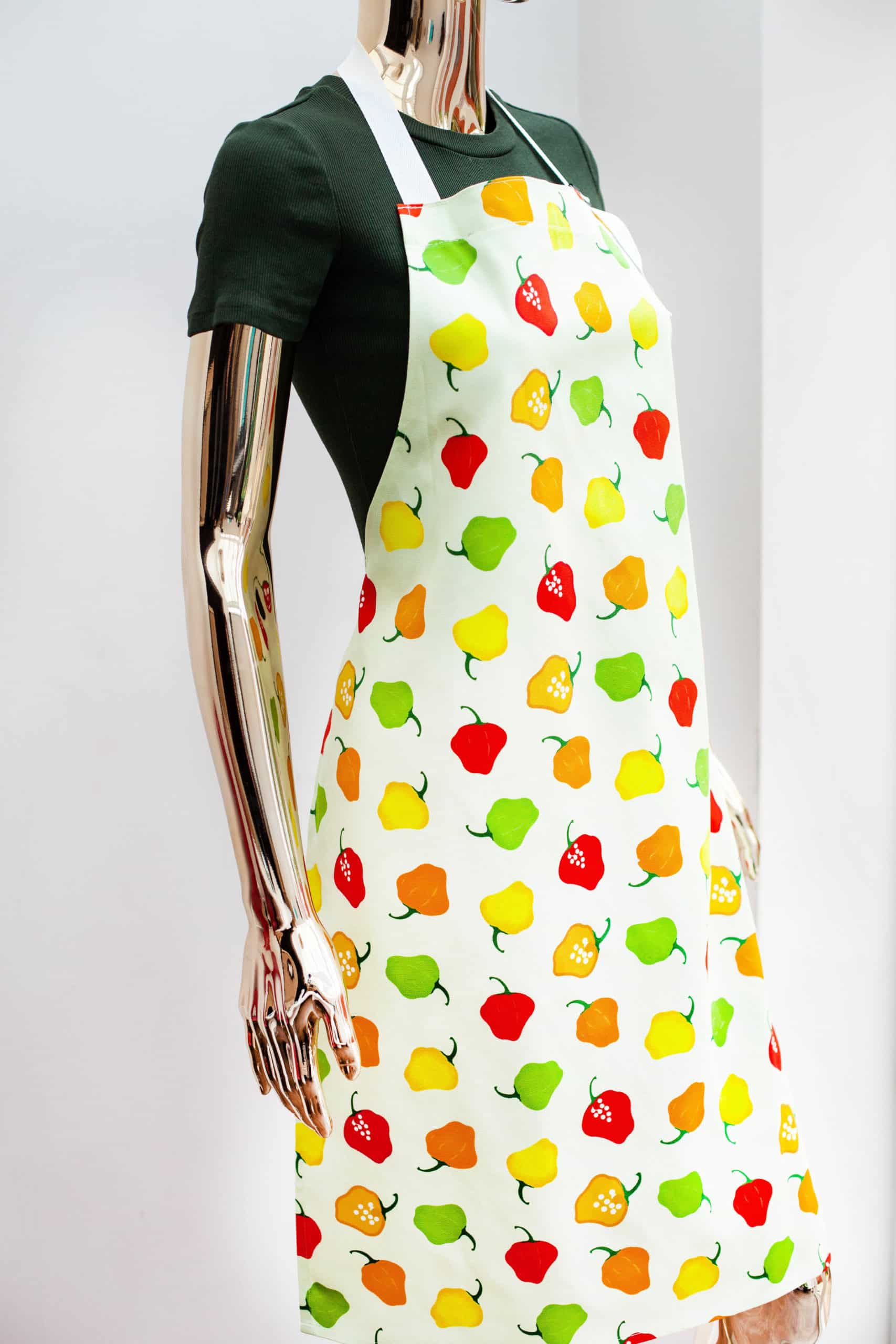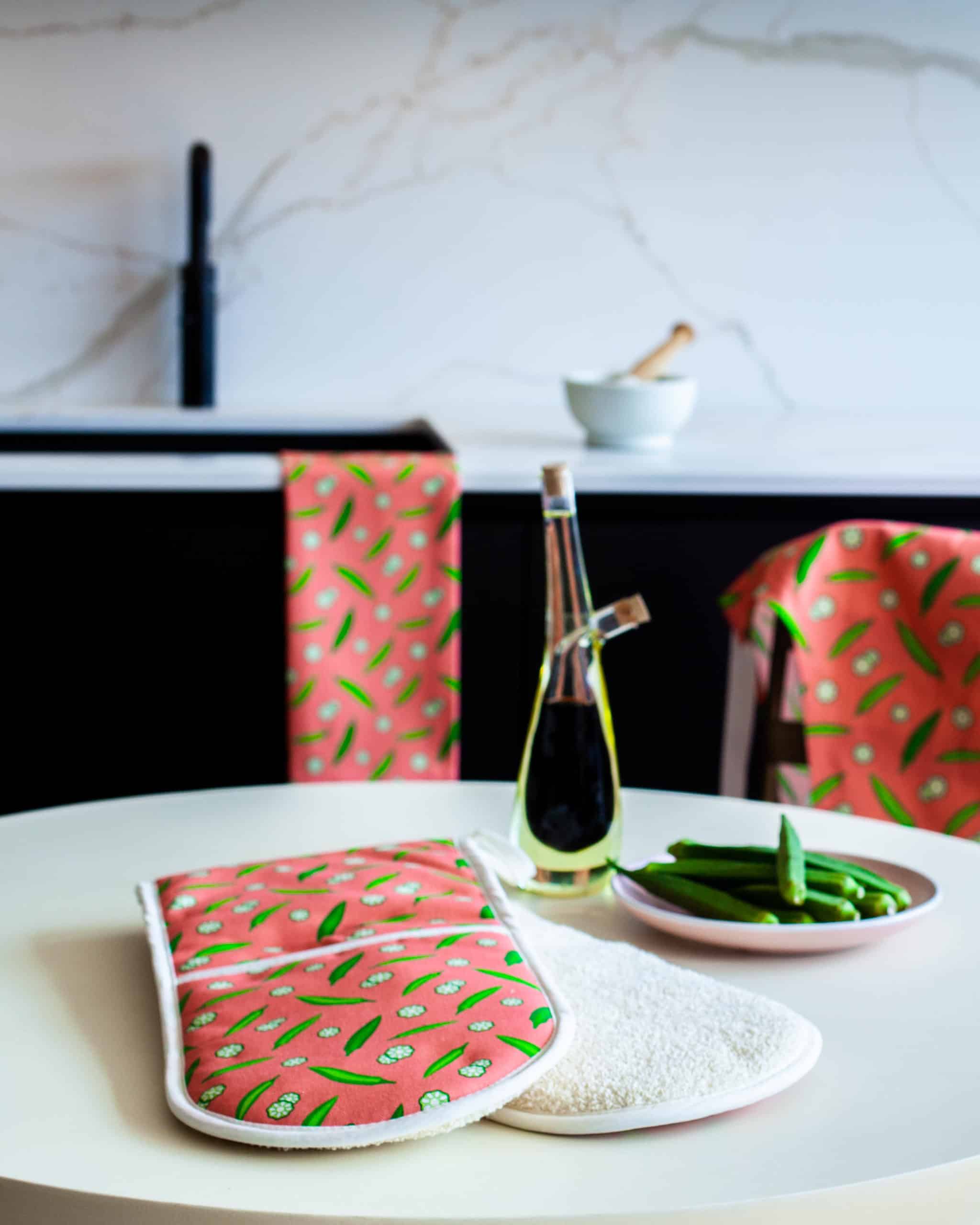 Grace explained that she now sells kitchenware – tea towels, aprons, oven gloves, napkins, place mats and coasters – with an African and Caribbean theme. They feature products which are common in African and Caribbean cooking such as the plantain, scotch bonnet pepper and okra. There is also a three legged pot design, which is used a lot in Southern African cooking and she has a gorgeous Ghanian kente design which incorporates cooking utensils.